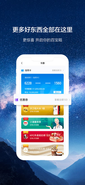 浦大喜奔,是一个金融生活方式。 ——浦发银行信用卡唯一官方APP 【产品特色】 1.便捷聚合支付:为更多人新增微信支付,支付体贴入微; 2.智慧生活地图:定位你身边的优惠,美好生活一键触达; 3.多彩精品页面:欢迎来到你的专属视界,为所想定制所享; 4.智能菜单排序:功能菜单智能热度排序,支持自主编辑; 5.账户自由管理:统一管理多家银行卡,支付还款更自由; 6.随心自在分期:定制化分期产品,梦想之路无需再等贷; 7.一手小浦头条:最新最火爆用卡资讯,干货满满喂饱你; 8.福利拿到手软:重磅福利,全在你的卡券百宝箱。 【联系我们】 官方微信:浦发银行信用卡