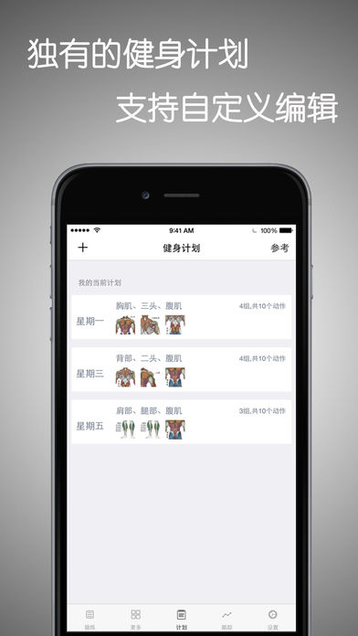 好消息,全网AppStore 最有型的健身软件 冰点价格 只要1元,内含丰富的健身动画,图文并茂,有独有的健身计划训练,唯一一款可以用户自定义计划的软件,包含锻炼跟踪,并拥有统计图表,适配所有iOS 设备,让您在家使用iPad 也可体验自上线以来数万人受益。好机会不容错过,投资健康才是投资自己和未来。 你还在为自己的一块腹肌而发愁吗,你还在对自己下垂的胸膛而烦恼吗。优秀的男人都应该拥有令人羡慕的胸肌和腹肌,以及强魄的身材。 本软件能够让你有计划的拥有自己的强壮体魄。为健身健康必备产品,多名健身教练联袂推荐。 【产品简介】 一款易用的健身健康类应用程序软件。风格清新,主要包括健身视频教程、每日晨跑、独有的健身计划、每日记录、健康资讯、收藏等等,内置多个小工具。用户可以通过该软件学习健身动作规范,设置自己的健身计划,记录自己的健身活动数据,以及阅览健康健身方面知识讯息。 包含大量家庭就可以完成的动作,让你轻松掌握动作要领,并配备大量健身相关资料,健身从现在开始,跟随作者的节奏动起来!软件宣言“身体是革命的本钱”,不管你是学生、or上班族、or健美爱好者等等,安装本软件统统帮您搞定,防止猝死,生命在于运动,打造美好身形,强健体魄何乐而不为呢,每天健身一小时健康生活一辈子。 【产品特点】 1.健身动画:助您轻松掌握健身动作要领; 2.健身秘籍:打造属于自己的健康图谱; 3.健身营养:健身营养是肌肉成长的必需品,没有我怎么能行; 4.健身收藏:让你收藏喜爱的健身动画,让你健身思路更清晰; 5.健身工具:多款健身工具助您打造完美身形! 6.健身计划:为你订制独有的健身计划,让健身更加科学和持久。 7.健身视频:海量健身视频,让你和健身牛人学健身。 8.每日晨跑:一日之计在于晨,让跑步开始你的一天吧。 9.每日记录:拍照记录自己的每日健身成果,让自己的变化被记录下来。 10.清晰的界面: 简洁干净的界面让您觉得更加舒适。