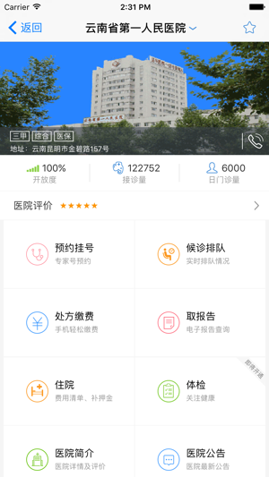 1000家医院!百万下载!国内医疗类第一APP!国内最大的IT公司东软集团(Neusoft)倾力打造,目前市场上唯一一款做透移动医疗的APP! 在这您可以: 【智能导诊】智能引导对症科室 【预约挂号】快捷远程预约挂号 【候诊排队】侯诊信息提前告知 【缴费支付】手机支付一键搞定 【查取报告】掌上报告想看就看 【亲友绑定】家人就诊轻松安排 【健康档案】个人专属安全私密 从此,不用排队,不用早起,不用电脑,不怕黄牛!还等什么? 大象就医,从容是一种生活方式! 【联系我们】 客服电话:4008015850 微信订阅号:大象就医 微博:@大象就医 官方网站: http://www.daxiang91.c…