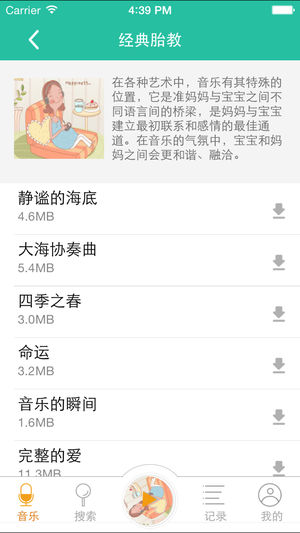 ^_^ ^_^ 胎教音乐盒,宝宝成长阶段的最佳精神营养。 应用程序简介: 1.为怀孕妈妈和宝宝精心准备海量胎教音乐,全程贴心陪伴孕期。 3.支持全文检索、关键字查询。 4.支持收藏和下载功能,方便您收听音乐。 5.优美合理的布局界面,效率护眼。 7.播放不间断,音乐永不停。 我们将不断更新数据,升级版本。谢谢您的支持和鼓励...