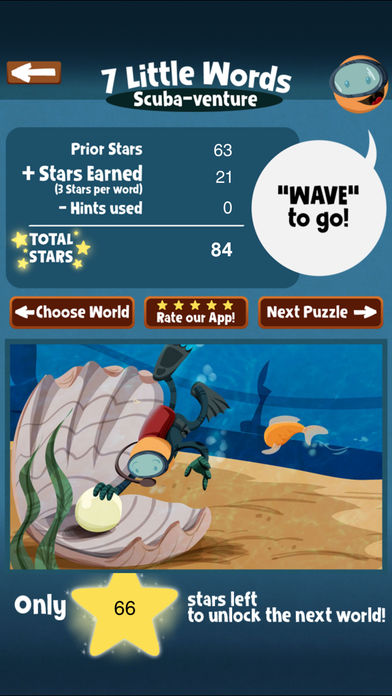 * 2013 Children's Technology Review - Editor's Choice Award for Excellence in Design * Well done. You've found the version of 7 Little Words that's made just for kids! Discover 7 colorful worlds as you solve the mini word puzzles. But don't worry if you get stuck. You can always get a hint if you need it. It's made just for kids, but many parents will love it too. 7 Little Words for Kids features: * KID SAFE! No ads and no in-app purchases * 350 EASY words and clues * Randomly generated puzzles for infinite replay * Earn stars to unlock each world * Cool statistics Discover 7 colorful worlds: * Scuba-venture * On Safari * The Museum * Down Under * Frozen Fun * Spacewalk * Dino-World Over 6,000,000 people have downloaded the grown-up version of 7 Little Words, which was recognized in O, The Oprah Magazine and which received an Honorable Mention for Best Educational Game in the 2011 Best App Ever Awards. From the creators of Moxie. Retina and iPad ready.