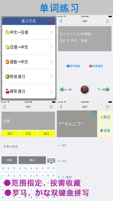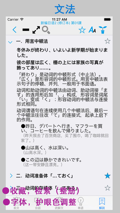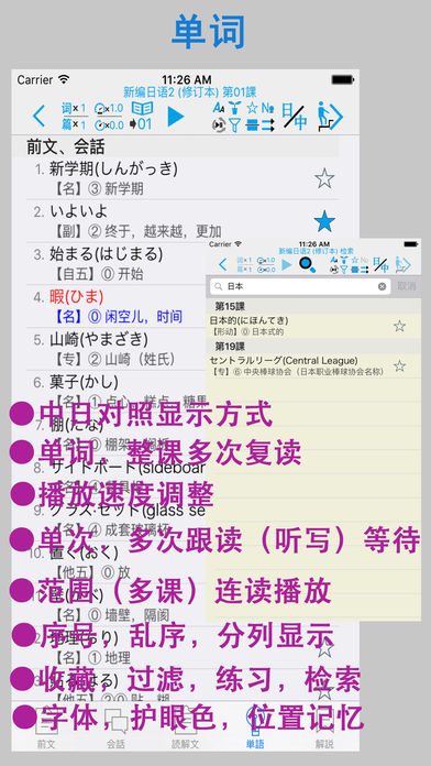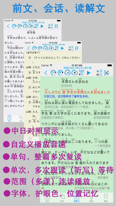 本APP参照《新编日语(修改本) 第二册》制作而成。包含了1〜20课的前文,会话,读解文,单词和语法等5大部分。全部的课文和生词都配有真人的发声。您可以通过手机和平板进行下载。方便任何有需要的朋友方便快捷的学习,能够快速强化您的听,说,读,写能力。本APP集成了超强的复读功能,可以根据自己的需要对每个单词、每句话或者整篇内容进行一遍或多遍的复读,洗脑式的复读可以加强记忆。同时,您还可以在“设置”里进行设置后台播放,方便您在移动中使用。 (注:如果您有任何购买问题咨询或意见反馈,可通过新浪微博:橙汁APP,或微信chengzhiapp 和我们取得联系) 语音复读模块: 在会话,课文和单词部分中,除了手工点击可以播放外,还集成了超强的复读功能。具体包括: ① 通过词[句]([词])按钮【左2】 调整 一句话/单词 的 单次复读次数(最大为99次)。 ② 在①的功能基础上,还可以通过[篇]按钮【左3】来调整整篇的复读次数(最大99次)。 在和①的功能组合使用的时候,一句话/一个词 最大可以复听(99x99)次。 ③ [音速]按钮【左4】用来调节发音的速度(0.5~2.0),帮助您找到适合自己的语速。逐渐的加强听力。 用来调节发音后的等待时间,(0.1~10),您可以在设置中设置适合自己的默认发声的速度。) ④ [等待]按钮【左5】置适合自己的默认发声的速度。)使用该功能可以方便您进行听写和跟随朗读。同时该功能也配合[句,词]功能进行多次跟读。 (您可以在设置中设置等待时间的单位(单词发音长度单位或时间秒单位)。) ⑤[范围]按钮【左6】用来调节复读的范围,通过该功能可以实现多课连续朗读。该功能可和上述①、②、③的功能同时使用,让您最大限度的使用复读功能。连课范围是:进入的课开始,选择的连课结束。例如:复读3-16课:第3课进入,选择16,点击播放即可。 ⑥ 如果在设置中打开后台播放功能(默认打开),就可以让您设置的复读声音进行后台播放。您可以通过耳机的线控进行停止/继续,在有在连课的时候,更能通过线控进行切课。(单击2次换下一课,单击3次换前一课,单击一次播放/暂停。) ⑦ 按钮 [▶]/[■]【左7】进入复读开始/停止。 课文,会话: ①为方便初学者,本APP为文章中的每个汉字加上了注音,您可以通过[ひらかな]按钮进行显示或隐藏的切换。 ② 显示切换:您根据自己的需求,通过工具栏上的[中/日/中日]的按钮进行中文或日文的显示/隐藏的切换。 单词部分: ① 显示切换:您根据自己的需求,通过工具栏上的[中/日/中日]的按钮进行中文或日文的显示/隐藏的切换。 ② 收藏模块:您可以通过每个单词右边的[星号]按钮,对单词进行收藏。并通过顶部的[星号]按钮,对收藏的单词进行过滤显示。 ③序号显示:可通序号显示按钮进行序号显示临时切换。 ④分列显示:更改屏幕的单词显示方式(上下显示,左右显示)。 ⑤乱序显示:更改屏幕单词的显示顺序。(支持复读) ⑥单词过滤:通过过滤按钮可以进行显示范围的调整。 ⑦练习模块:通过顶部的[练习]按钮,您可以切换到单词的练习模块。本APP集成了“中文->日文”、”日文->中文“、”中文->语音”,“听说比对” ,“单词拼写”等(以下)五个练习模块。(※ 1,※ 2,※ 3) a. “中文->日文”练习:根据中文内容选择相应的日文。 b. “日文->中文”练习:根据日文内容选择相应的中文。 c. “语音->中文”练习:根据听到的声音选择相应的中文。 d. “听说比对” 练习:通过录音,及回放比对您的发音和标准发音。 e. “单词拼写” 练习:通过提示的中文,通过键盘(kana或罗马字)拼写出假名。 ※1 练习模块可和收藏模块进行配合时,可对自己选定(收藏)的单词进行练习。 ※2 练习模块可和范围模块进行配合时,可对特定范围进行练习(例如:第一课进去,选择连课16课的时候,练习范围就是1-16课的单词)。 ※3 练习模块可同时配合收藏,连课2个模块一起使用。 语法解释: 收纳了课本中的语法解释部分的所有语法及例句。 其他: ◎你可以通过左右滑动进行切换课(向左滑动上一课,向右滑动 下一课) ◎在设置中您可以设定使用后台播放(默认) ◎在设置中您可以设定默认的语音速度 ◎在设置中您可以设定后台播放时定时关闭的时间 ◎在文法界面,右上角有一键打开全部文法的按钮 本APP采用iphone,ipad的双版本设计,一次购买,可在iphone,ipad上同时使用。 APP 中的大量内容,是作者手工录入的,如果您发现不对的地方,望在APP里的意见反馈中联系我们,我们会在定期的版本更新中,修正您提出的问题。谢谢。 如果您喜欢这款app,请赠予评价,将是对我最大的鼓励,您的好评会让我更有动力将这款app做到最简洁,最方便,最实用!! 注1:本APP不含有内购和广告。 注2:本APP不是电子版的教科书,是一款配合教科书的学习用的APP,我们侧重了学习语言最重要的2个部分-听力及其单词记忆,为此我们开发了这款带有超强复读的APP,并对单词部分提供多种练习。 注3:如需想对APP进行功能试用,请下载,新编日语体验APP。