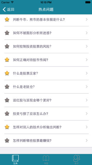 这个炎热的夏季,炒股越炒越热,已经逐渐成为继房地产与黄金之后,全民投资的新热点。然而,每天面对着各类专家的评论,各种复杂难懂的线条,烦躁的数据,买或者是不买,抛或者是不抛,这都是个问题。静下心来,泡杯茶,放下不安的心,希望[全民炒股必备宝典]对您有所启发和帮助。 该APP囊括了股票术语,股票知识,技术分析,名人名言,大师的智慧,热点问题六大股票相关内容。 +内容介绍 1.股票术语-包含入长多,长空,多头,基本面等300多条股票类名词解释。 2.股票知识-包含了股票基础,股民须知,股市常识等10个章节的股票知识点,可以让您对股票有个全面的认识与理解。 3.技术分析-包含了道氏理论,波浪…