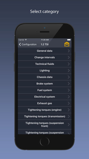 The application contains technical information that will help you in the repair and maintenance of your car. Data is divided into categories: general information, chassis, tightening torques of bolts and nuts, fuel system, brake system, lighting lamps, a replacement intervals and volumes of technica…