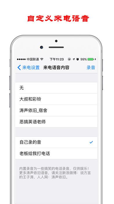 如果你正在参加一个普通朋友的生日party(聚会),或者正在参加一个不必要的会议,再或者相亲时遇到丑男丑女,来电模拟都能给你一个离开的理由... 您也可以通过本APP恶搞朋友,效果特别理想... 优点: 1.跟系统通话界面相似度:100%。 2.可以选择模拟时间、来电者、铃声、来电语音内容、壁纸等。 3.可自定义铃声、自定义通话内容。 4.贴近耳朵屏幕变黑。 5.完美适配iPhone6和6+。 6.可设置挂断后的虚拟桌面,也可设置返回真实桌面。 7.操作简单。 PS : 此APP提供虚拟来电功能,仅供娱乐,并不提供真正的打电话功能。
