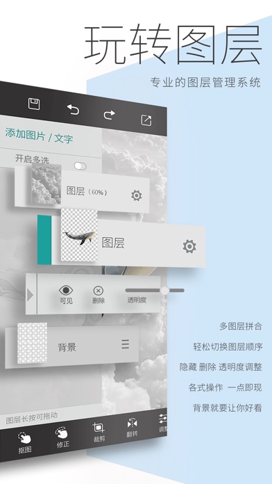 PhotoWeaver是一款功能强大的专业图片编辑应用,独家图层设计,强悍的抠图工具和仿制图章工具,如同随身携带了photoshop。功能强大,操作简便。 开放性的设计,让你可以更充分的展示你的创意。唯一限制你的,只有你的想象力。 特色功能 1.图层管理 ·轻松添加图片和文本至图层列表 ·图层可自由添加删除,放大缩小,切换位置,调整透明度 ·多个图层完美融合,天马行空的创意都可以实现 2.智能抠图 ·拍照时,使用魔棒可以动态去除背景,效果非常奇妙 ·智能抠图与精准抠图相结合,加上像素级的擦除和修复,可以完美抠出图片中想要的部分 ·放大图片 + 画笔大小调节 + 放大镜提示 = 专业级操作体验 3.仿制图章 ·选中一个锚点,便可将其完美的复制 ·去除水印,复制图案 4.历史记录 ·所有操作都可以回退,前进,反复修改不用担心 ·未完成的工作,可以归档,中间过程全部保存,方便下次继续使用 5.完美体验 ·剪切、翻转、调整、滤镜、涂抹、画笔等功能一应俱全 ·所有修图需求全满足,再不用在手机里下载无数的图片处理应用 ·专业制图,设计精美,简洁高效 6.在线分享 ·支持Facebook、Instagram、微信、QQ ·随时随地轻松分享