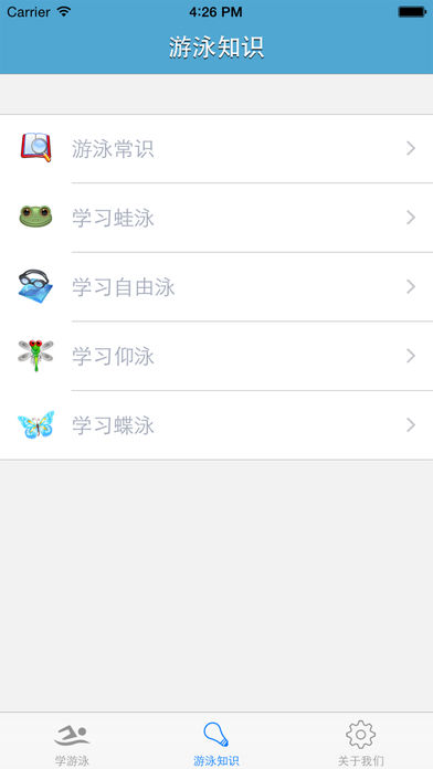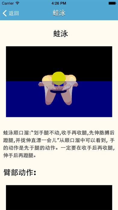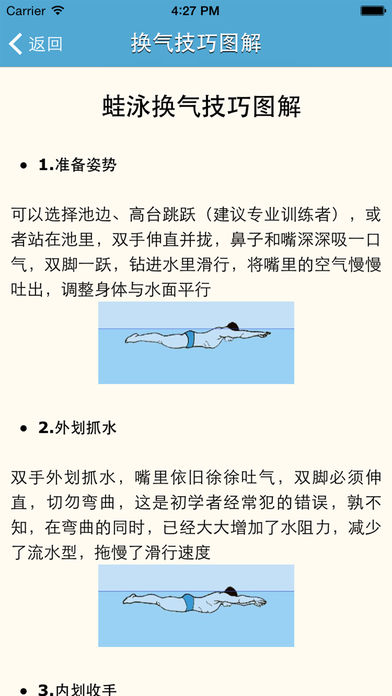 游泳是一项需要较高技巧的体育运动,初学者在学习过程中会遇到很多障碍。本应用汇集了蛙泳、自由泳、 仰泳、蝶泳等基本泳姿的学习方法,采取图文并茂的方式把泳姿的学习呈现在用户面前。 还详细整理了在入水前所要进行的准备,是你学习游泳的必备应用。 特点: 1. 帮你快速学会正确的游泳技术 2. 3D动画详解四种泳姿 3. 各种泳姿都有详细的教学视频 还在犹豫什么,这么一款优秀的游泳教学软件,正准备学游泳的您还不赶紧下载下来?