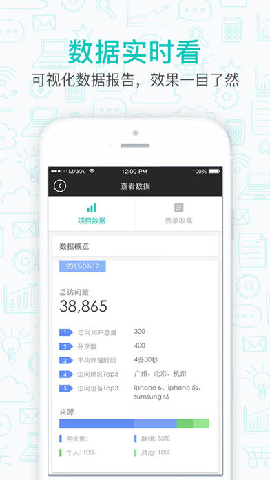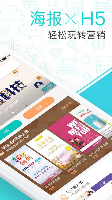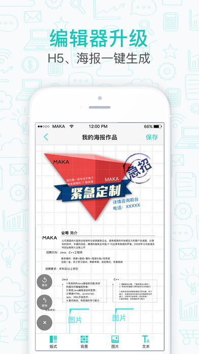 MAKA是一款简单、强大的创意设计和营销推广工具,5万+原创设计师,海量主题模版实时更新,帮助企业和个人用户方便快捷地完成专业级别的H5创作与海报设计 「打造刷爆朋友圈的H5」 零设计基础也能一分钟制作出酷炫特效的H5场景,让你的朋友圈有声有色!点击拖拽即可轻轻松松添加或替换文字、图片、音乐等元素,预览效果后分享。10秒钟上手,1分钟创作,极简的操作方式超越PPT! MAKA提供详细的访问报告、受众群体特征、城市分布、访问设备型号等,帮助用户从数据中发现针对性问题并随时调整,实现更高效传播刷爆朋友圈。 「强大图片编辑合成•海报」 别人的朋友圈配图怎么那么好看?那是因为你没用过MAKA!10万+优质素材,做海报、拼美图、修自拍一键全搞定,让你的图片瞬间高大上。 除了个人秀美图外,海报功能也适合企业用户在制作节日祝福海报、邀请卡、公众号封面、微商朋友圈广告等,省去繁琐的设计步骤,一键生成高质量图片,做你的掌上设计师。 【适用场景】 音乐相册、美照拼图、旅行记录、问候祝福、企业招聘、会议邀请函、节日促销、学校招生、个人名片、朋友圈配图等 =============创意营销,选择MAKA============= 微信服务号:maka_2014 微信订阅号:H5college 反馈邮箱:support@maka.im