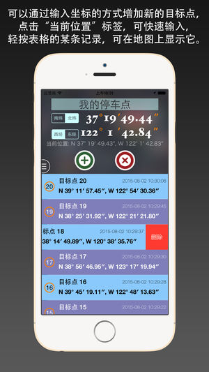 这是一款界面美观、操作简洁却功能强大的寻点工具,它可以使您实时地观察当前位置和目的地之间的距离,从而帮助您快速到达目的地。 您可以在地图上选点,也可以手工输入坐标,设定目标点位置。 [功能特征] 1. 操作简单:只需要长按地图就可以设定目标点,也可以手工输入坐标。 2. 数据导出:支持KML和CVS格式的点位列表导出功能,KML文件可以用Google Earth软件打开。 3. 支持全面:支持iPhone全系列产品,iPad全系列产品,支持含有定位传感器的iPod系列产品。 4. 单位完备:包括米、公里、英尺、英里、海里等五种单位。 5. 帮助提示:有操作提示,有帮助说明,用户可以快速掌握…