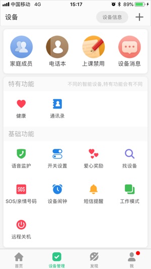 1 微聊:APP 可以录音并下发给设备,设备也可以录音下发给APP 2 定位:APP 可以查询设备的最后位置并在地图上显示出来,可以查询设备的实时位置 3 健康步行: APP 可以查询设备的历史运动情况,统计结果 4 轨迹: APP 可以查询设备的历史轨迹 5 安全区域:app 可以设置围栏,当设备从围栏内部到围栏外部时,APP 将收到提示信息 6 信息中心: 设备低电量提醒,出围栏提醒 7 手表闹钟:APP 设置设备的闹铃时间 8 找手表: APP 下发指令后,设备将响铃 9 爱心奖励: APP 下发指令后,设备上显示爱心 10 设置: APP 可以设置 SOS/亲情号码,工作模式,语…