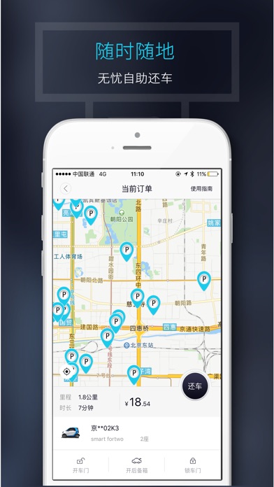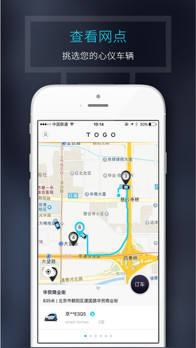 TOGO是基于移动互联网的汽车共享出行平台,为用户提供城市内的即时,短程出行服务。TOGO按分钟计费、自助租车、随地还车的运营模式,为用户带来犹如私家车一般的高品质出行体验,可满足出行、购物、聚会等各种出行需求。现阶段,TOGO通过使用更节能、环保、智能车型,希望可以有效降低机动车给城市带来的城市污染和交通压力。 TOGO用户通过LBS技术定位预定距离您最近的车辆,可即时或提前15分钟预定,全程手机控制车辆(包含车门开关,闪灯寻车等功能),自助开启自由旅程,到达目的地后,将TOGO共享车停放在任意一个合法停车位、通过App完成费用支付即可。用户仅需为单次车辆出行使用支付费用。TOGO标准化的线下运营体系包揽了驾车以外的所有事宜,为用户出行提供安全、标准、便捷的服务体验。