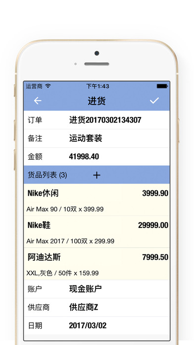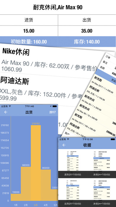 DailySales 3 正是您需要的,把生意搬到手机上来管理。让做生意更简单,去除繁杂的流程和不必要的功能。 面向广大生意人及个体户的销售管理、采购管理、供应商、客户关系管理、仓库进出货管理、财务管理、资产管理工具。一边管理一边销售,统计分析,轻松打理您的旺铺。 现有特性: - 管理采购、销售、库存、商品、供应商、客户、个人财务 - 生意订单、商品库存生成长图片收据存档,可随时预览与分享 - 支持自定义商品(商品分类与商品子类)、记账类别(父类与二级分类)、多账本、自定商品单位、型号、参考售价、进货均价、初始库存等 - 每个订单,对应一个 或者 多个商品条目,并自动计算出订单的应付、应收总金额 - 商品单位、型号、备注供选择,让录入数据更加快速 - 统计每个商品的库存、销售数量 - 提供柱状图表、饼图统计 - 清晰展示商品的单价、数量、总额等 - 快捷查找,匹配所有的商品 - Touch ID & 手势密码保护数据 - 个人财务方面,提供自动/手动记账模式,可选择日期补录 - 清晰明了的月份统计图表与每月的金额流向管理 - 选择不同的订单类型、两个时间范围导出数据,通过邮件导出Excel数据 ~为生意人定制,适用于所有实体店 采购、销售、库存、个人财务、实物商品、服务项目都能管理。他们都在用: 美发美甲屋,咖啡馆,宠物店,淘宝店,微店,餐厅,茶馆,花店,影楼,甜品店,文具店,五金店,杂货店,玩具店...... ~简单,明细到每笔采购与销售 无论身在何处做生意,掏出手机立马开始管理,甚至每笔销售、每笔采购、每位供应商。帮助大家把生意看得更清楚,其实并不复杂;抛开繁琐,立即找到您想要的。 ~专注,把握店铺经营核心 管采购、管销售、管库存、管商品供应,一部手机搞定,把握店铺经营核心。手机虽小,进销存、生意管账所需要的基础核算管理一个都不少;统计报表,费用构成与趋势图形,清晰明了。 PS: DailySales3 是经过无数个浓茶与咖啡伴随的不眠之夜才最终完成。 如果您喜欢 DailySales3,请花几秒钟在 App Store 上给个鼓励,开发商会持续更新 DailySales3。如果您在使用方面遇到了问题,请不要在 App Store 上留言(因为开发商无法在 App Store 给您答复), 您可以直接在应用中的 关于页面 > 点击 FAQ 图标 > 将宝贵意见反馈给我们。 在此先表示感谢 !