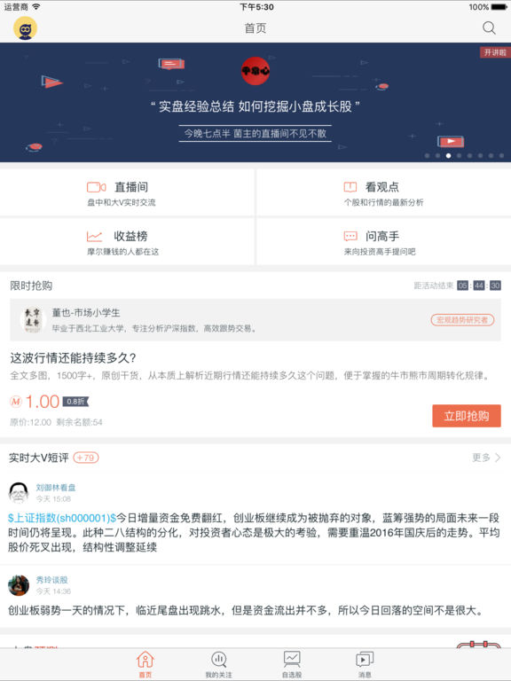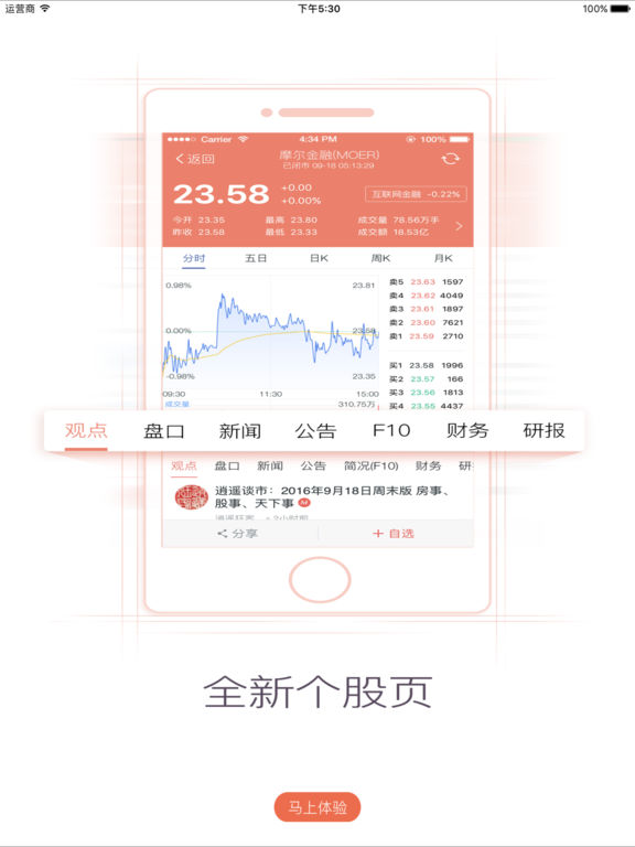 摩尔金融定位于为用户提供最好的投资服务,平台汇聚3000+投资高手,提供股票知识、股票分析、股市最新消息、专业研报、宏观经济分析与热点解剖。股市直播间全天实时交流,与投资高手互动、交流炒股心得。 【最全最及时的大V直播】 莫大:摩尔独家直播,擅长宏观趋势分析,微博顶级财经大v。 laoduo:短线高手,专注基本面和游资心理分析,对纯资金推动题材理解深刻,擅长研究次新股。 卫Wesley:擅长短线及波段操作热点强势股,精通高送转,经常提前预判行情拐点。 布莱德雷将军:微博大v,博弈交易体系,擅长逻辑分析和市场博弈。 时冲:专注逻辑推演,“舞步”“三方一体”等多种短线与中线技术和“逻辑分析”技术的创始人。 长安大湿人:摩尔金融2015年度十大撰稿人,供职于全球化投资团队,A股擅长龙头股战法和跟庄战法,外盘和期货主要做趋势交易。 柯中: 投资实际上就是找自己身边最热门的事情,然后把他们细化,细化到最后的上市企业。 JOKER皇:资深职业超短交易员,擅长半路追涨、打板、低吸恐慌、首阴等,尤其擅长锁仓吃尽龙头主升浪让利润飞奔。 绕指缠:精通缠论及均线理论;特别是“逃顶三字经/谈缺口/论K线/说背离等”7篇技术专题已经让数千人短短数天从小白成长为炒股高手,你还不来?! Jacky一路向北:微博资深股评师;财富自由,人生无忧,我不是为了赢,我只是不想输。 ......更多顶级撰稿人、投资高手,等你来发现。 【新用户福利】 付费文章免费试读300,不花钱也能看付费文章,快来找找都有哪些优质标的吧。 第一次下载的用户连续3天领取文章免费券。 【今日股池】 每日精选股池,看高手判断牛股必杀技,牛股可以免费加入自选股。 股池每日精准踩中热点,累计成功率超过90%。 【产品功能】 1、投资观点,支持免费、付费,付费观点剖析更深度,价值更高; 2、支持自选股、股票行情服务; 3、在线观看股市直播服务; 4、支持问答、群组、私信等服务; 5、训练营课程,深度学习股知识; 6、支持关注动态,及时获取大v的动态及更新。