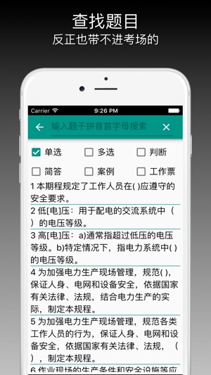 参照2018年国网安规调考题库制作(其实和2016年,2017年安规也差不多),含有线路、变电、配电、基建、动力五部分。网络题库中加入了2018版安规,包括变电、配电、电缆、电建、线路220kV及以上,线路220kV,监控、信息、通信等专业 包含单选、多选、判断、简答、案例、工作票、填空等题型。 拥有搜索、错题、考试、朗读及其他乱七八糟没有用的功能。 判断题,答案为错的题目,含有解析。 与其他软件相比,优点大概是,没有弹窗,没有广告,不联网,不强制评论