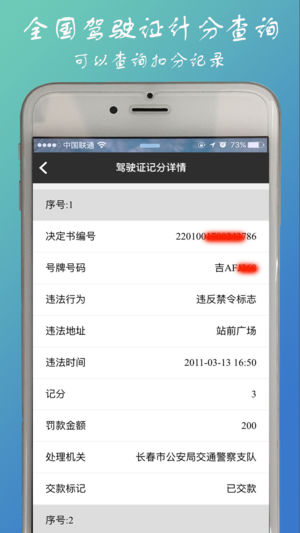 根据输入的驾驶证号和档案编号,查询驾驶证的计分状态等信息。简单查询不需要注册,但查到的信息量比较少,注册查询,查询到的信息量比较多,可以查询到扣分记录信息,方便用户选择使用。还有专职客服人员为您服务哟。