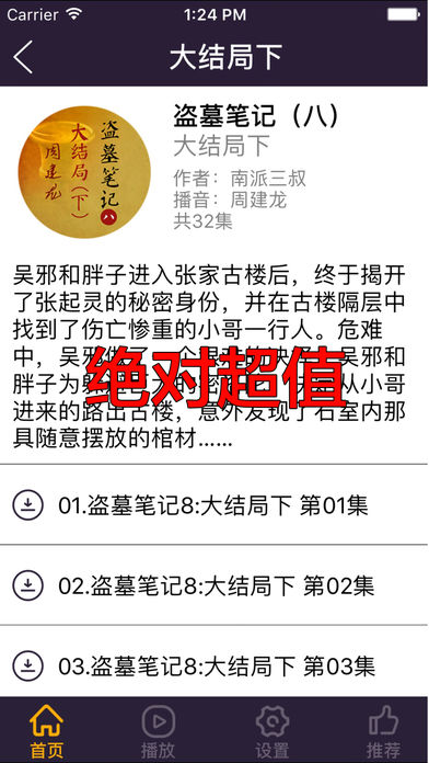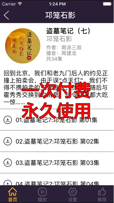 说明:本软件为收费版本,没有任何广告,没有任何内付费情况,一次付费,软件内所有资源均可下载收听! 目录简介:本软件包含:《盗墓笔记》全集;《鬼吹灯》全集;《藏海花》全集;《沙海》全集;《老九门》全集;《大漠苍狼》全集;《怒江之战》全集;《东北往事之黑道风云20年》全五部;《茅山后裔》全集;《我当阴阳先生的那几年》全集;《张震讲鬼故事》全集;《花千骨》全集以及精品推荐内容:恐怖悬疑系列内容,如:包含《神墓》,《东北的邪乎事儿》,《屌丝道士》,《风水玄术-墓闻录》,《麻衣神相》,《谜踪之国》,《都是地府惹的祸》,《守墓人》,《青雪故事之真人秀》等等等等;百家讲坛系列内容,如:《易中天品三国》,《先秦诸子百家争鸣》,《汉代风云人物》,《两宋风云》,《易经的奥秘》,《新解三十六记》,《正说清朝二十四臣》等等等等; 具体目录如下: 1.本软件包含:周建龙播音《盗墓笔记1:七星鲁王宫》,《盗墓笔记2:秦岭神树》,《盗墓笔记3:云顶天宫》,《盗墓笔记4:蛇沼鬼城》,《盗墓笔记5:谜海归巢》,《盗墓笔记6:阴山古楼》,《盗墓笔记7:邛笼石影》,《盗墓笔记8:大结局上》和《盗墓笔记8:大结局下》所有音频;至此,《盗墓笔记》周建龙播音全部整理完成,共9部;(包括盗墓笔记大结局); 2.本软件包含:青雪播音《盗墓笔记:第一季》,《盗墓笔记:第二季》,《盗墓笔记:第三季》,《盗墓笔记:第四季》,《盗墓笔记:第五季》,《盗墓笔记:第六季》,《盗墓笔记:第七季(大结局)》,《盗墓笔记:番外篇》所有音频;至此,《盗墓笔记》青雪播音全部整理完成,共7季+番外篇;(包括盗墓笔记大结局); 3.本软件包含:青雪播音《盗墓笔记之藏海花》以及骆驼播音《盗墓笔记之藏海花》; 4.本软件包含:青雪播音《盗墓笔记之沙海》(包含《沙海1:荒沙诡影》和《沙海2:沙蟒蛇巢》两部全集);以及骆驼播音《盗墓笔记之沙海》(包含《沙海1:荒沙诡影》); 5.本软件包含:夜媚播音《盗墓笔记之老九门》; 6.本软件包含:周建龙播音《鬼吹灯:精绝古城》,《鬼吹灯:龙岭迷窟》,《鬼吹灯:云南虫谷》,《鬼吹灯:昆仑神宫》全四部; 7.本软件包含:青雪播音《鬼吹灯:精绝古城》,《鬼吹灯:龙岭迷窟》,《鬼吹灯:云南虫谷》,《鬼吹灯:昆仑神宫》全四部; 8.本软件包含:艾宝良播音《鬼吹灯:精绝古城》,《鬼吹灯:龙岭迷窟》,《鬼吹灯:云南虫谷》,《鬼吹灯:昆仑神宫》,《鬼吹灯:黄皮子坟》,《鬼吹灯:南海归墟》,《鬼吹灯:怒晴湘西》,《鬼吹灯:巫峡棺山》全八部; 9.本软件包含:青雪播音,南派三叔著《大漠苍狼:绝地勘探》和《大漠苍狼:绝密飞行》全两部;以及艾宝良播音,南派三叔著《大漠苍狼:绝地勘探》和《大漠苍狼:绝密飞行》全两部; 10.本软件包含:艾宝良播音,南派三叔著《怒江之战》全部音频; 11.本软件包含:周建龙播音《东北往事1:黑道风云20年》,《东北往事2:黑道风云20年》,《东北往事3:黑道风云20年》,《东北往事4:黑道风云20年》,《东北往事5:黑道风云20年》,全五部; 12.本软件包含:《茅山后裔》全集,共268回; 13.本软件包含:《我当阴阳先生的那几年》全集,共194回; 14.本软件包含:《张震讲鬼故事》全集,共115集; 15.本软件包含:《花千骨》全集,共145集; 16.本软件包含:新增精品内容,恐怖悬疑系列内容,包含《神墓》,《东北的邪乎事儿》,《屌丝道士》,《风水玄术-墓闻录》,《麻衣神相》,《谜踪之国》,《都是地府惹的祸》,《守墓人》,《青雪故事之真人秀》,《无限恐怖》,《酒神》,《行尸天下》,《阴阳师》,《975夜故事珍藏版》,《张盾讲夜故事》,《新张盾讲夜故事》,《捉鬼专家》,《鬼吹灯之牧野诡事》,《贼猫-鬼吹灯前传》,《鬼吹灯外传》,《鬼吹灯同人》,《鬼吹灯之寻龙诀》; 17.本软件包含:新增精品内容,百家讲坛系列内容,包含《易中天品三国》,《先秦诸子百家争鸣》,《汉代风云人物》,《两宋风云》,《易经的奥秘》,《新解三十六记》,《正说清朝二十四臣》,《在清华听演讲》,《于丹论语心得》,《于丹论语感悟》等等等等; 18.(注:新增精品内容位于推荐页面,而不是首页,不是主页面,望知晓,即最下方的工具栏,首页-播放-设置-推荐,位于推荐这个页面,非常感谢您的支持。) 等等,更多精彩内容,请下载体验! 软件功能: ●●●●●可以自动记录播放位置,不用担心下次找不到听到哪里; ●●●●●支持离线播放功能,即使不联网也一样听,到哪都不怕; ●●●●●精准的睡眠定时功能,让您睡眠更轻松; ●●●●●可以自动顺序播放功能;支持后台播放; ●●●●●支持手动拖拽前进、后退播放功能; ●●●●●通用应用,同时支持iPhone,iPod touch和iPad设备; ●●●●●还在犹豫什么?更多精彩,尽在App当中,让“散仙”带您走进土夫子的世界吧!绝对超值! 联系QQ:2697977088;如您在使用本软件过程中遇到任何问题,请加QQ联系!谢谢!