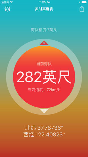 这是一款外出旅游、户外达人的必备的软件,让你以最快的速度获取到所在地的海拔、GPS位置、方向、速度和气压等信息。 【高度表】实时测量海拔,无需网络就可以准确测量所在地的海拔和经纬度,支持单位在米和英尺间切换。 【指南针】本软件内置指南针,让你更快的获取所在地的方向。 【速度计】走路、骑行、在车上时候想随时知道自己的速度?无需网络,打开软件马上就能看到。 【水印相机】不错过在高山之巅的最美一刻?来一张水印自拍吧,照片上会以水印记录拍照时所处的海拔。 【iPhone X适配】更新后的实时高度表已适配iPhone X,愿美观的界面给你带来好心情。 【Apple Watch支持】内含Apple Wat…