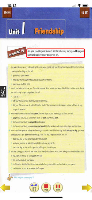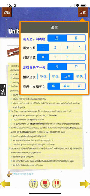小虫子点读机,点哪里读哪里。兼容ipad和iphone。 本程序供学习高中英语人教版(必修)教材的学生使用。 本程序除了像普通点读机一样能点读课本外,还能设置【是否自动下一句】、【朗读重复次数】、【朗读延时间隔】、【显示中文和英文】、【点读声音速度调节】功能。 具有复读功能。支持后台锁屏播放;同时支持划屏翻页操作。 具有书写功能,可以边听边写。 单词学习模式包括单词浏览、英文点读中文、中文点读英文、单词默写功能。 注意:本程序可点读内容仅包括官方磁带内容,并不包含所有书本内容,但为保证阅读的完整性,则程序包含了除点读外的其他阅读内容。 又因高中英语翻译量太大,故本版本中内容没有进行中文…