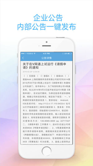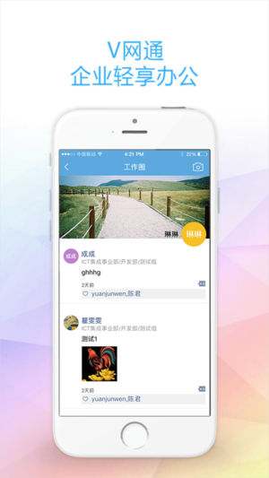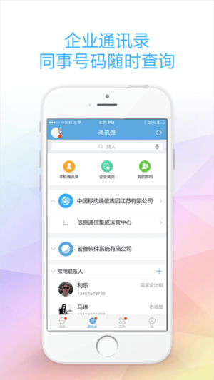 V网通是江苏移动为政企客户量身打造,可提供融合通信和移动办公一体化企业内部交流工作。以集团通讯录、IM、工作圈为基础,公告发布、任务管理、电话会议、考勤、薪酬等办公轻应用,支持行业应用和企业个性化应用自主接入,满足企业移动办公的数据安全性、反应及时性等需求,帮助企业降低沟通成本,提升工作效率。