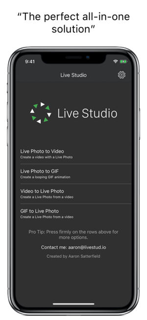 Live Studio是一款处理实况照片的超级软件。只需要这一个软件就足够了,而且它支持所有设备。 快速保存和分享实况照片到你喜欢的软件。 一次选择多张实况照片转换成视频。 把视频, GIF和连拍快照转成实况照片,然后把它用作iPhone6s/6s Plus的壁纸!创建无限长的实况照片。 直接在Safari中使用新操作扩展将GIF转为实况照片。 Live Studio支持多种转换: -转实况照片为视频 -转实况照片为GIF -转视频为实况照片 -转GIF为实况照片 -转连拍快照为实况照片