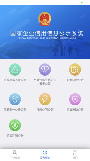 一、公示依据 本系统信息公示依据《中华人民共和国政府信息公开条例》、《企业信息公示暂行条例》等法律法规、规章的有关规定。 二、系统功能 1、本系统提供全国企业、农民专业合作社、个体工商户等市场主体信用信息公示和查询服务。 2、查询市场主体信用信息,输入名称或注册号进行查询。系统支持按名称的关键词模糊查询。对于无效的查询条件,将不会显示查询结果