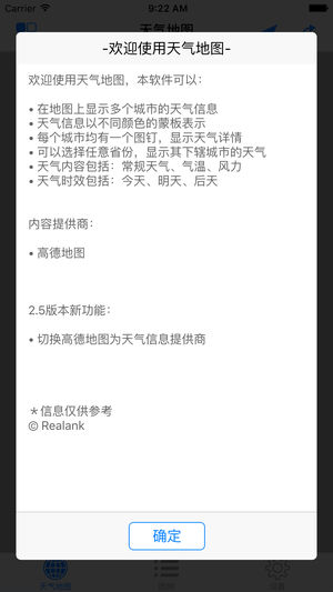 在地图上显示各个城市的天气信息! 当您旅行的时候,可以通过本APP查询沿途的天气情况 - 2.6版本: • 更新UI