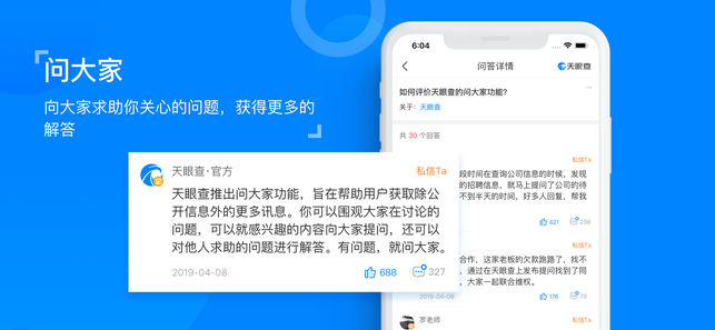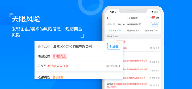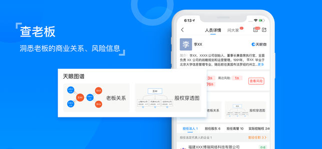 天眼查专注于企业信用信息工商征信查询,为各界人士提供丰富、全面、客观、权威的企业信息,是各界商务人士必备的企业征信利器。 天眼一下----让查人变得更简单,查公司变得更快捷。 查企业、查老板、查关系,查征信、查信用、找客户、谈合作、做调研,就上天眼查! 目标人物关系网任意查,想知道的公司信息随便找,百余种数据维度等你看。 关系梳理透明化,专业信用报告呈现等高阶功能,明星和老板们都在用,适用于所有人群。 天眼查实时洞察商业讯息,成功人士都在用的商业安全工具,下载天眼查APP免费查询。 【什么样的人在用天眼查】 建筑建材:寻找合作伙伴,监控合作企业信息 媒体记者:探索商界内幕 业务销售:下…