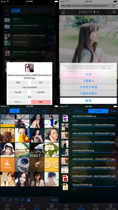 『All Downloader』可以从网站高速的下载文件到iPhone/iPod,并且它能浏览/播放很多常见的文件格式。为了尽最大可能的提高下载速度,它具备了多线程下载技术,可以同时启动多条线程下载同一文件,很多时候都能达到或小幅超过您网络带宽的上限。另外,如果某次下载在中途中断了,可以从中断的位置继续下载. 关键功能: 下载和上传 - 内置网页浏览器,方便的从网站下载文件 - 具备多线程下载技术,针对同一个文件,它可以同时启动多条下载线程,最大限度的提高下载速度。 - 具备断点续传技术,如果某次下载在中途中断了,可以从中断的位置继续下载。 - 批量下载图片,您可以批量下载某个页面中的所有照片 - 长按网页中的图片下载 - 长按强制下载 - 可以保存正在浏览的网页 - 具有全功能的下载管理器,允许随时暂停、继续、删除下载中或已下载的文件 - 下载的照片可以保存到系统相册 - 关闭屏幕后或切换到其它软件时,依旧可以保持下载(10分钟之内) - 可以利用WiFi,USB,或者电子邮件导出下载后的文件 文件浏览 - 内置多种文档阅读器,支持常见的文档格式(PDF,DOC,PPT等等) - 为TXT文件设计了专用阅读器,可以更改文字大小,颜色等等,专为长时间阅读设计! - 保存文档的最后阅读位置 - 内置专用的图片浏览器,轻松浏览您的图片 - 浏览文档或照片时可以锁定屏幕方向 文件保护 - 您可以创建多个文件夹,并且为某些文件夹设置密码,然后把您不希望别人看到的文件放到里面。 文件管理 - 全功能的文件管理器,不但可以管理下载的文件,还可以管理通过WiFi或USB上传的文件 - Zip,RAR压缩解压 - 支持创建文件夹,每个文件夹都可以设置密码 - 支持在文件夹之间移动文件 - 可以一次操作多个文件,可以批量删除,复制,粘贴,重命名,压缩等等 - 可以拍照或从相册中导入照片存储为文件 - 可以输入文本保存为文件,并可以编辑