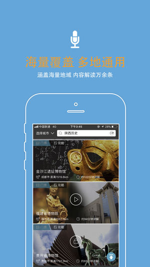 赛导游app为您提供全国旅游景点博物馆智能讲解。 该软件用手机通过特殊精确室内定位和GPS技术,自助听景点导览。内容来自馆区内的一线讲解员和导游,当您进入博物馆或景区时,独有的智能传感技术,能实时通过互链的地图自动感应讲解眼前的景点及文物,同时感知您当前的位置,内容涵括千余件文物和大遗址、遗迹及100+以上景区,包括以文字、图片、语音及其他延伸解读资料和深入浅出的特色讲解。同时还支持室内精准定位、雷达扫描展品、路线规划以及传统编号查询,参观中您只要把手机放到口袋中就能感受到真人导游的讲解体验,省去了您在旅行中高额雇佣导游和租赁导览器设备的繁琐,是您旅行中的必备神器。 [亮点功能] · 智能导…