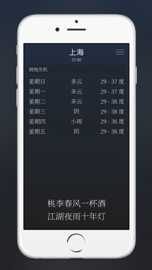 App Store「2015趋势盘点」「一元精选专区」推荐; 应用推荐媒体「AppSolution」重点推荐; 「雨时」,为您提供更诗意的查看天气方式。 - 精准的实况天气与未来七天预报,覆盖全国两千五百余市县地区以及全球五万城市; - 任何时间、任何天气都有与之契合的诗词相伴; - 写意的天气背景与动态天气效果;