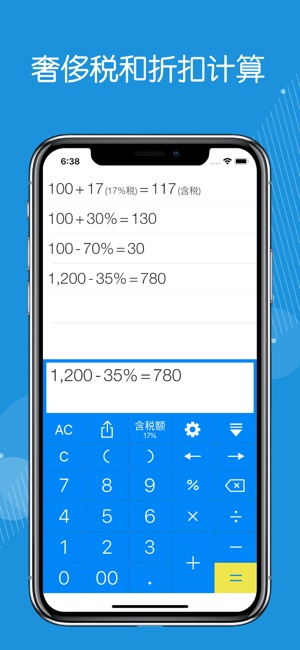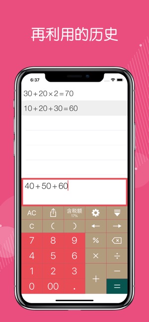 这是非常方便和易于使用的计算器。当你要计算你可以快速计算出。还有一个方便的功能,如增值稅和折扣计算。 主要功能 1. 它可以是,保持并重新使用表达式是可见 2. 營業稅的计算 3. 折扣计算(%) *** 1. 它可以是,保持并重新使用表达式是可见 输入你会看到公式。并以相同的次序作为数学,而不是与输入的顺序进行计算。 1 + 2 × 3 = 7 每次计算时间,表达和答案将留在历史上。坚决你可以看到从后计算的内容。 表达和答案可重复使用。为了重复利用的答案,按历史。再利用的表情,对历史的左侧的长按显示菜单或没有解除手指跟踪。 *** 2. 營業稅的计算 并显示划分的计算结果。 100…