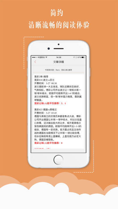 产品介绍: 一、 专业大师分析,预测比分发布,资讯内容推送。 二、 竞彩信息通知,赛事内容报告,赛事信息深度挖掘。 三、 综合赔率数据计算,赛事背景,球队分析,场地情况,球员资料。 四、 全球博彩资讯,精准提供有效赛事。 竞彩猎手是一款针对竞彩足球、足球胜负彩、篮球彩票等各种竞技彩票玩法的专业推荐、预测及分析工具。竞彩猎手汇聚彩票行业多位名家高手、大师,集合了丰富的赛事情报和数据,深度挖掘赛事信息、综合赔率数据、赛事背景、球队积分、场地情况、全球博彩资金流向等关键要素,为彩民提供最为精准和有效的赛事预测资讯。 早餐解析:针对每天所有竞彩赛事进行初盘分析,第一时间快速获取当日赛事情报,综合前期对阵双方的资讯、做早盘点评和预测。 专家推荐:聚合行业名家高手、大师,在赛事临近开场前做关键场次精准推荐。 彩友观点:竞彩猎手欢迎民间高手向我们投稿,像足球论坛的精华贴一样,我们会每天精选彩友的观点,随时随分享出来。 竞彩猎手在接下来的版本中,也会丰富更多的产品类型,体育竞技游戏、棋牌游戏类产品都是竞彩猎手的运营方向。希望可以在球赛之外,分享更多更有趣的内容给广大彩友。敬请期待! 竞彩猎手,弹无虚发!