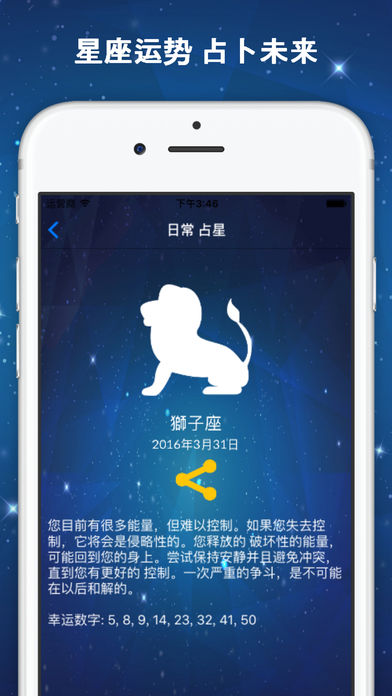 * 感谢您使我们的#1星座运势应用在中国 * 每日星座运势是最先进和最最好的星座运势应用程序的 iPhone 和 iPad。只需每日星座运势 App 为普通话星座运势的。 每日星座会给你一天的星座在汉语语言为你的生肖西方占星术的基础。 它是唯一的星座运势应用程序将提供超过 19 种语言,它非常准确所有星座。 特点: - 你的生肖运势 - 星座运势每日查询, 爱情运势, 健康运势, 事业运势, 财运 - 2016 年生肖星座 - 星座运势每日更新 - 星座运势更新通知 - 与任何人通过 Facebook、 Twitter、 Whatsapp、 Snapchat、 Instagram,Kik、 微信、 电报等分享星座运势。 - 每日星座运势超过 19 种语言 - 你可以读白羊座星座运势、 金牛座星座运势、 双子星座、 巨蟹座运势预测、 狮子座星座运势,处女座星座运势、 天秤星座运势、 天蝎星座运势、 Saggitarius 星座运势、 摩羯座星座运势,水瓶座星座运势和双鱼座星座运势 每日星座运势 App 提供爱星座运势、 事业星座运势和钱星座作为通过购买应用程序中的高级服务。你可以订阅这些星座运势类型上 1 个月自动可再生订阅 订阅费是 $5.99/月为完整的星座或 2.99 美元/月爱星座运势或钱星座运势或事业的星座,每个星座运势类型。每个订阅将自动续延每一个计费周期后除非取消。重建成本将会订阅费相同 完整的星座运势提供 7 天的免费试用。您可以访问完整的星座运势 (爱情、 金钱和事业星座运势) 为免费高达 7 天从一开始的试用期。一旦 7 天试用期结束,你将收取 5.99 美元/月通过您的 itunes 帐户 订阅费将通过您的 iTunes 帐户列为经常性交易 (自动可再生订阅),并将自动更新,除非您取消您的帐户当前订阅月底前至少 24 小时。您可以管理您的订阅、 随时取消或可能由后购买到用户的帐户设置去关闭自动续订 请注意,在积极订阅期内允许当前订阅没有取消 请如果您遇到任何问题或 bug, 联系 interclickmedia@outlook.com 你可以阅读我们的隐私策略/使用条款 http://www.mydailyhoroscopes.org/privacypolicy.html 你每日星座运势是只是一个水龙头走了