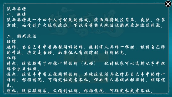 地道的家乡味道,我们的理念是,要让每一个朋友都能在我们的作品中找到自己老家的味道,特别是让那些身在外地,甚至身处海外发展的老乡们,想家的时候消遣娱乐一下,听一听原汁原味的家乡话,打一打地地道道的家乡牌!同时希望愿意体验和尝试陕西味道的朋友乐在其中!祝愿所有外出的朋友,平平安安显身手;没有外出的朋友,健健康康展宏图! 游戏简介 陕西麻将是一个四个人才能玩的游戏。陕西麻将玩法简单、爽快,计算方便,而受到广大玩家欢迎。下炮子等特色玩法让游戏更加激烈刺激。 麻将是由明末盛行的马吊牌、纸牌发展演变而来的。而马吊牌、纸牌等娱乐游戏,又都与中国历史上最古老的娱乐游戏——“博戏”有着千丝万缕的联系,甚至是“血缘”关系。现在流行的棋、牌等博弈戏娱,无不是在博戏的基础上发展、派生、演变而来的。同时,麻将的各种技巧要领更是花样百出,品种繁多,防不胜防。