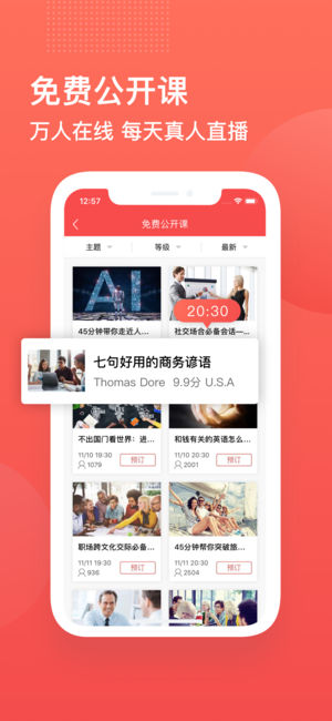 新人驾到,注册立享购课9.5折优惠!最高可立减2000元! vipabc品牌全面升级为TutorABC,iTutorGroup集团旗下TutorABC(vipabc)由美国硅谷技术团队研发创立,凭借独家研发的DCGS动态课程系统,将遍布全球80多个国家、100多座城市的专业英语外教与学习者精准匹配,并为英语学习者打造定制的课程、教材和全英语环境,学英语口语更有效,无需奔波,随选随上,全方位提高英语能力,像姚明一样学英语,敲开世界的大门。 【优势介绍】 1)真人在线互动,一键学英语365天×24小时,只要有网络,在任何地方,与专业外教学英语。 2)严格筛选,全球优质英语外教来自美国、加拿大、英国…