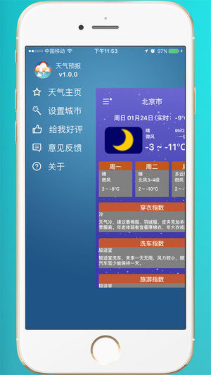 【产品简介】 包含全国3000多个城市天气信息,采用国内外多家气象机构数据,天气信息权威、准确、全面。提供信息全面24小时预报、精准的未来3天预报。空气质量、污染指数、温度趋势、PM2.5 等更加丰富、精准天气信息!提供穿衣、洗车、紫外线、感冒、运动、旅游等生活指数,是您日常生活、出行旅游的必备APP! 【特色功能】 1.语音播报:甜美女声为您播报当前天气。 2.选择城市:独创的通过地图拖动选择城市功能,自动定位城市。 3.周边天气:调用附近地图,真实坐标查阅当前城市天气。 4.生活指数:提供穿衣、洗车、紫外线、感冒、运动、旅游等生活指数。 5.当有恶劣天气将要来时,我们将提前推送通知提醒您…