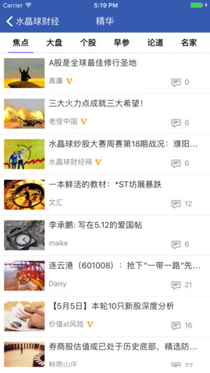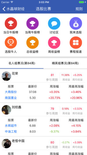 水晶球财经APP----高手云集的自媒体股票社区,一个专注于为投资者提供股市投资交流的社交网站,用户可自由发布股市投资心得、实盘操作等,目前已经聚集了大批炒股高手。用户还可参与模拟炒股比赛、实盘大赛、选股比赛、投资计划等,并跟随炒股高手进行交易。