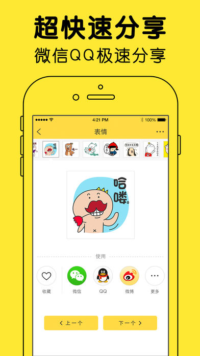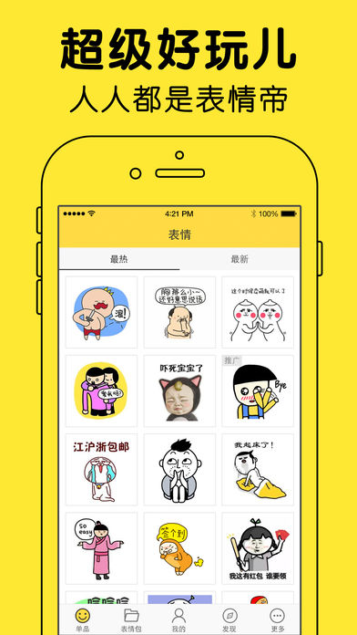 产品简介: 超级表情是一个超级好玩的表情App 超过100,000个表情,真正的海量表情全球首发 天天更新,张张精彩,专属表情随心淘,再也不用担心跟别人表情雷同了 功能简介: 1、最全的高品质表情库,海量表情任你选 2、紧随热点,时下最火的表情,全都不会错过 3、影视、动漫、搞笑等各类表情随你挑 4、每天实时更新,最新表情抢先听 5、最全表情包,清晰明确,保证您可以快速定位自己的爱好,找到自己想要的 6、轻轻一点,微信,QQ一键直达 此乃打造您专属爱机的必备应用,千万不要错过哦!