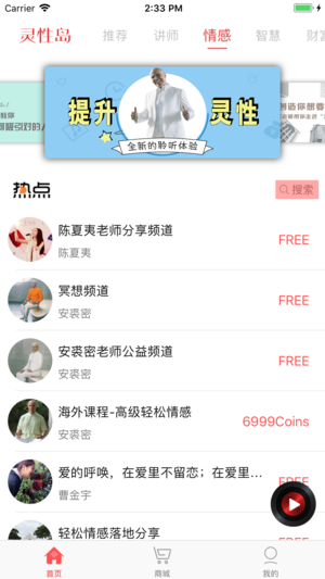 【灵性岛】是专注于用户与讲师的音频平台,在这里用户可以收听讲师发布的音频,获得心灵与精神世界的释放。同时,平台会展示线下的研讨会排期,让用户了解讲师的最新动态。平台愿景:提升人们的能量。