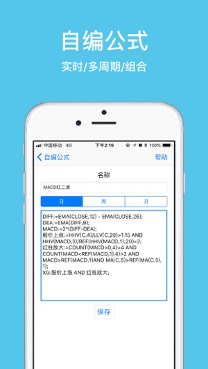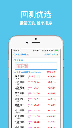 =====选股助手 选股神器===== 本软件主要功能包括7大类选股方式,超百种选股方法。手机端第一款自持自编公式选股的选股软件!兼容通达信、同花顺等的大部分选股公式。 【1】支持自编公式选股,日线、周线、月线自编公式实时选股 【2】支持策略回测,最大盈利概率,最高平均收益 【3】回测优选功能,批量回测,胜率排序!!极大提高选股效率和成功率! 【4】支持所有类型选股策略自由组合,复合周期,复合类型 【5】含多种盘中选股策略:分时强势,万手买单,主力净流入,回踩均线,尾盘拉升等等 【6】支持多周期选股(30分钟、60分钟、日、周、月) 【7】包含多种流行的特色选股策略:涨停预测,九转序列,缠…