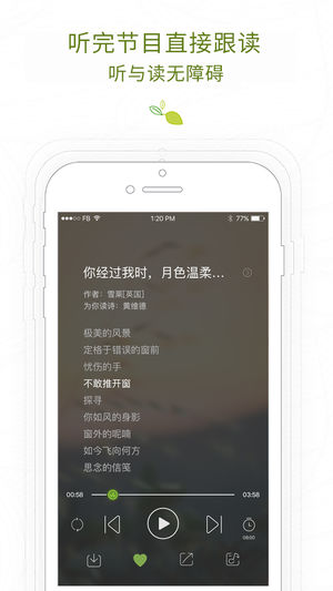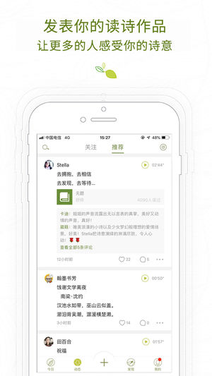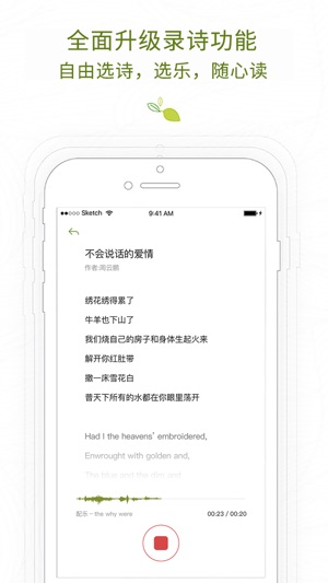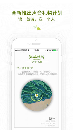 在诗里,与更大的世界相遇 觉得世界安定美好,有时候只是因为一首小诗,恰好写出了你此刻的心情。 在这里,「为你读诗」每天精选一诗、一画、一乐、一文,带你聆听这个世界上最干净美好的声音,找回诗歌的纯真年代。 在这里,你可以写下你心中的世界,遇到同样相信并且热爱诗歌的人。同他们一起,在诗里与更大的世界相遇。 在这里,你也可以读一首诗,给你爱的人、给依然相信并热爱诗歌的你自己。而喧闹的时代里,你的声音,就是最好的礼物。 更新内容: 【我的读诗】读诗功能升级,可自选诗文及配乐,部分诗文支持直接跟读。 【声音的礼物】读诗作品可作为声音的礼物分享给好友。爱是温柔的事物,TA也一定能从你读的诗里,听…