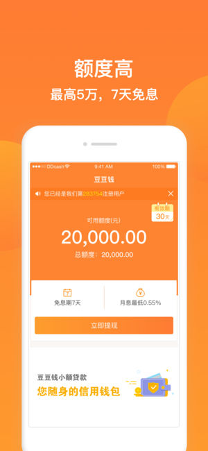 豆豆钱,是一款互联网智能信贷APP,可为人们提供1000-50000元的贷款服务。纯线上操作,到账迅速。急用钱,找豆豆钱。 豆豆钱,是维信金科下的一个专注于移动互联网贷款平台,旨在为人们解决急用钱问题。维信金科依托10年行业数据累积、经验沉淀,建立了领先业内的智能化“蜂鸟云风控系统”和多维度评分卡体系,打造更好的智能金融产品。 [产品特色] 该产品为用户提供1000-50000元额度的贷款,纯线上操作,7天免息,月利息低至0.55%,最快当天可放款。 [产品功能] 用户可在各大应用市场下载豆豆钱APP ,或通过豆豆钱微信服务号来注册申请。 1. 无抵押贷款,纯线上操作 用户通过手机即可申…