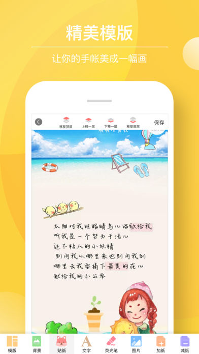 简介: 【优势】女生必备装机应用 【优势】独创精品手帐本打印 【优势】原创大批量潮萌素材 ... 手帐是什么? 手帐本是女生喜欢的一种记录生活的方式, 与传统日记不一样,内容可更加丰富... 多彩手帐就是让你更加快捷的记录生活, 有更多的好玩 素材、贴纸 供你选择... 【Color·精品优质功能】 ·原创免费素材 每周原创更新潮多免费素材,免费又好玩又时尚 ·原创付费素材 每周给付费用户定制专属付费素材... 带动周围潮流,让朋友同学 都跟随你的脚步 贴纸、模版、背景、花边笔 每周大批量更新,一应具有 ·精品手帐本打印 国内首家独创:精美排版算法 + 多种精美实体素材 自己厂家生产:独此一家,各种手帐周边素材 --在线PDF预览 独创自有算法,在线生成PDF手帐,打印前可预览 ·自定义皮肤频道 原创素材,紧跟潮流,主题皮肤任你挑选 ·红包频道 用红包,可赠送给好友,也可购买你喜欢的好玩素材 我们也会定期免费送出大额红包哟! ·发现广场 在这里找到你的志同道合,发现你喜欢的手帐 感受别人的多彩生活,学习好玩的手帐玩法 ·离线记录,离线下载 没有网吗?别担心,没有网也可以记录哟! 离线功能满足你的一切需求 ·一键抠图,方便快捷 点一下即可抠图,不浪费你多一分的时间,方便快捷 ···多彩陪伴,下载就给你更多惊喜! ----------------- 咨询|合作|广告 等,联系: qq:731128239