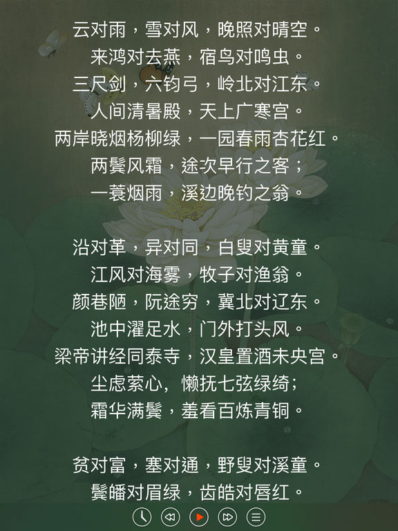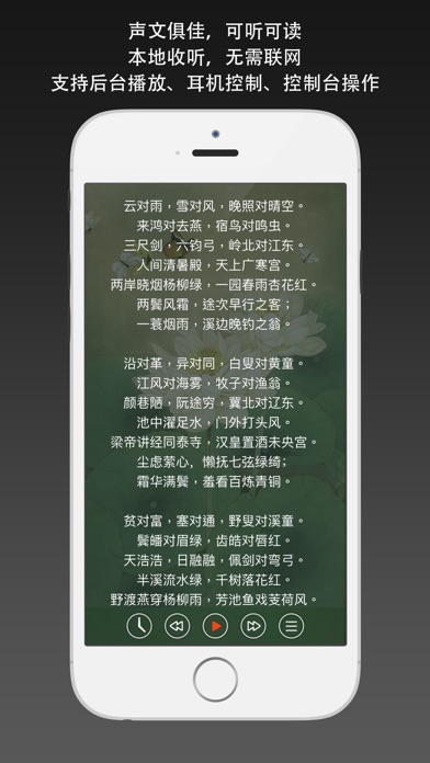 清代名士车万育作品《声律启蒙》,上下两卷,按韵分篇。 无广告,无内购。本地收听,无需联网下载声音文件。 支持后台播放、耳机控制、控制台操作、进度保存,支持滑动手势。 诗词和对联是中国古代重要的文学形式,两千多年来一直薪火相传,至今仍具有强大的生命力。在古代,自私塾的幼童起,就开始这种文学修养的训练,对声调、音律、格律等都有严格的要求。因此,一些声律方面的著作也应运而生,而其中清朝康熙年间车万育所作的《声律启蒙》,则是其中较有代表性的一种。 《声律启蒙》是训练儿童应对、掌握声韵格律的启蒙读物,分为上下卷。按韵分编,包罗天文、地理、花木、鸟兽、人物、器物等的虚实应对。从单字对到双字对,三字对、五字对、七字对到十一字对,声韵协调,琅琅上口,从中得到语音、词汇、修辞的训练。从单字到多字的层层属对,读起来,如唱歌般。较之其它全用三言、四言句式更见韵味。这类读物,在启蒙读物中独具一格,经久不衰。明清以来,如《训蒙骈句》、《笠翁对韵》等书,都是采用这种方式编写,并得以广泛流传。 作者:车万育(1632~1705年),字双亭,号鹤田,湖南邵阳人。康熙甲辰进士,官至兵科给事中。康熙二年(一六六三),与兄万备同举湖广乡试,明年成进士,选庶吉士。性刚直,直声震天下,至性纯笃,学问赅博。善书法,所藏明代墨迹最富,有萤照堂明代法书石刻十卷。 [收录内容] 01.上卷.一.东 02.上卷.二.冬 03.上卷.三.江 04.上卷.四.支 05.上卷.五.微 06.上卷.六.鱼 07.上卷.七.虞 08.上卷.八.齐 09.上卷.九.佳 10.上卷.十.灰 11.上卷.十一.真 12.上卷.十二.文 13.上卷.十三.元 14.上卷.十四.寒 15.上卷.十五.删 16.下卷.一.先 17.下卷.二.萧 18.下卷.三.肴 19.下卷.四.豪 20.下卷.五.歌 21.下卷.六.麻 22.下卷.七.阳 23.下卷.八.庚 24.下卷.九.青 25.下卷.十.蒸 26.下卷.十一.尤 27.下卷.十二.侵 28.下卷.十三.覃 29.下卷.十四.盐 30.下卷.十五.咸