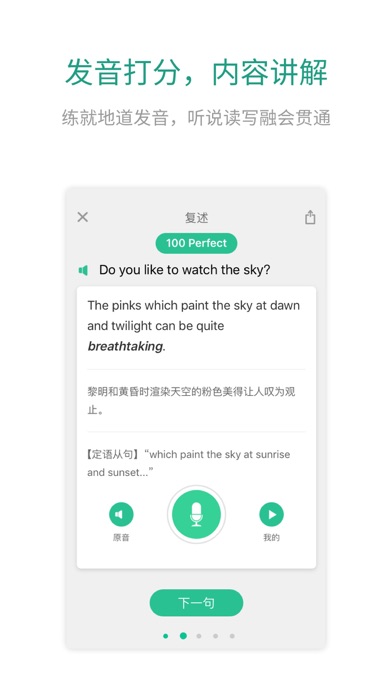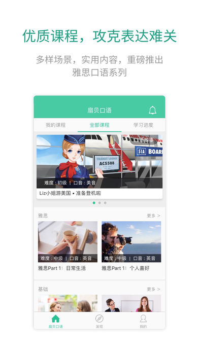 独一无二的动漫式口语学习模式: 优秀游戏原画师制作的人物和场景图,采集自多伦多国际机场以及美国机场入境处的实景环境音,让你身临其境互动式学习,还可以欣赏自己的配音作品,不断改进提高,轻松掌握实用表达。 课程内容: 雅思口语、生存口语、OMG美语、商务礼节英语。不管你学的是中考英语、高考英语还是大学英语四六级,不管你在备考雅思、托福还是立志提升职场英语能力,都能找到适合自己的课程。应试、旅游、交流……真实情境,掌握地道英语口语。 不止于说: 英语口语、单词、语法和听力全面提升是扇贝口语的独到之处。拒绝单一跟读模式。提前预习重点词汇,事半功倍。跟读模仿阶段智能打分,纠正发音错误。提供逐句中文翻译。听音复述,不给文本,完全凭借记忆(对,就是要虐)。还可以将你的发音分享给朋友,学习路上不孤单。 备考雅思: 模块化的主题设计,精选雅思口语考试高频题,邀请 native speakers 撰写内容,驯化舌头,地道表达、精彩词汇脱口而出。 学英语口语,在扇贝: 坚持扇贝一贯的优秀品质,学习进程中的每个生词都可以即时添加到自己的学习计划中,利用扇贝强大的记忆系统进行学习。友善的小组社区,让你在英语学习的路上不再孤军奋战。通过打卡让你坚持,有千万的小伙伴都做到了用扇贝坚持学英语。 也许你会突然发现,开口说英语是一件这么上瘾的事情。 如需帮助,请致信help@shanbay.com 欢迎微博关注@扇贝网,微信订阅shanbay17,和扇贝君做朋友~