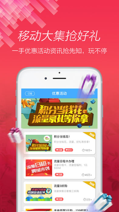 【产品特色】 ※优惠活动。优惠流量、积分抽手机、送电子券、话费... ※查流量。通用、夜间、限时、定点、省内/漫游流量,剩多少,清晰明了。 ※手机积分当钱花。换加油卡、电影票、视频会员卡... 【最新动态】 优惠活动可以评论、可以分享了!