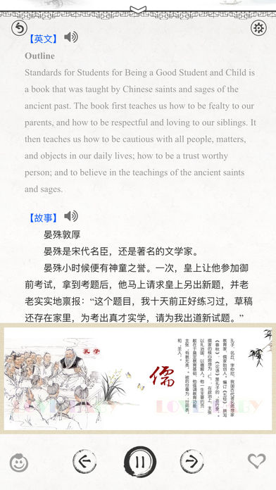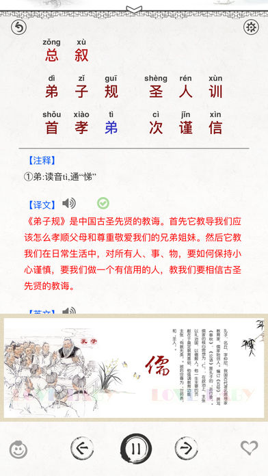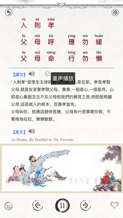 学国学,知礼仪、识大体、长见识、会感恩、懂谦虚、提素质、讲担当! 领略国学魅力,弘扬传统文化。国学的智慧,是中国人生存发展的精神动力和文化源泉。应由更多的家长、老师、学生…共同发扬分享。 这一系列的国学APP,有专业的国学开发团队制作:配有专业语音、专业插图、专业解析!是国学复兴必备软件! ◎功能特点: 1、纯净无广告,支持iPhone / iPad 等任何苹果设备和任何版本的iOS系统。 2、图文并茂,高清、精美的诗意插图,更易学习与理解。 3、 拼音长按可隐藏,排版合理,中国风界面,赏心悦目。 4、名师朗诵诗词,可选儿童朗读,译文也带语音。专业好听,字幕同步。支持离线听读。对儿童早教特别有帮助。 5、 励志故事:为了能更好地学习这部文化经典,特别提炼了《弟子规》中的人物典故 “90个励志小故事”。 6、 注释、译文、启示、赏析与详解、英文翻译、简体/繁体 7、 屏幕取词:每个汉字或词语都可选中进入词典(中文解释/英文翻译) 8、 背景音乐为国学古典音乐,贴切主题,听国学时感觉美妙无比。 9、 随心收藏,快速找到自己喜欢的诗词。 10、 支持后台播放、单首诗词循环播放。走到哪、听到哪、看到哪。 11、 单个播放或者循环播放;所有内容(包括收藏夹)循环播放。 做最适合学习的国学启蒙软件,引领大众“简单学国学”。 《弟子规》(原名《训蒙文》)是中国传统的启蒙教材之一,作者是清朝康熙年间的秀才李毓秀。后经贾存仁修订改编而成为弟子规。其内容采用《论语》“学而篇”第六条“弟子入则孝,出则弟,谨而信,泛爱众,而亲仁,行有余力,则以学文。”的文义,列述弟子在家、出外、待人、接物与学习上应该恪守的守则规范。 《弟子规》共有360句、1080个字,三字一句,两句一韵,和仄押韵,朗朗上口;全篇先为《总叙》,然后分为《入则孝》、《出则弟》、《谨》、《信》、《泛爱众》、《亲仁》和《余力学文》七个部分。 《弟子规》集孔孟等圣贤的道德教育之大成,提传统道德教育著作之纲领,是接受伦理道德教育、养成有德有才之人的最佳读物。 有问题可随时联系我们: 邮箱:angellixf@foxmail.com 网站:http://blog.sina.com.cn/angellixf 您的满意是我们的追求,您的肯定是我们的动力,如果您喜欢本软件,请给我们好评,谢谢!
