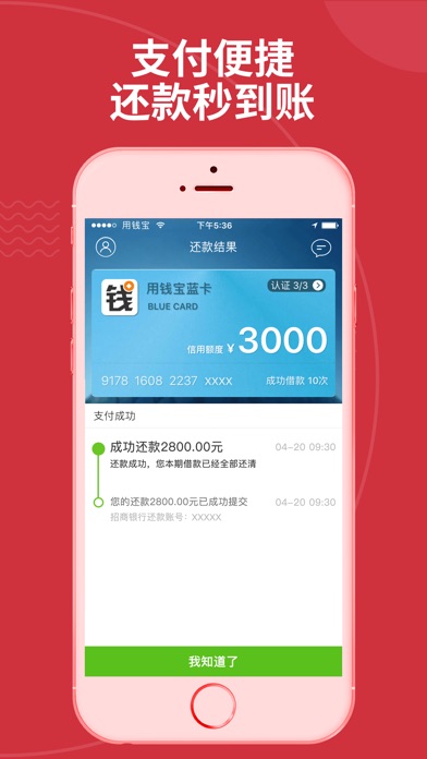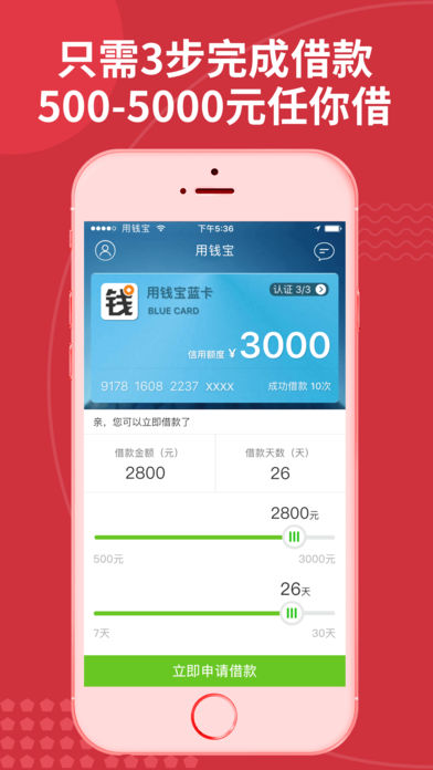 最近急用钱,但工资还没发,手头比较紧;找父母要又不好意思,找亲戚朋友借又开不了口,怎么办? 用钱宝Pro为您解决这种烦恼,只需要花费3分钟时间,就可以完成借款申请,我们的系统会自动处理您的请求,最快可在10分钟内放款。 【产品特色】 1、操作简单:资料填写方便,实现三步网上借款,引入人脸识别系统,刷脸即可提现,再也不需要信用卡。 2、极速贷款:最快十分钟放款,机器自动评估方便您借钱、借款。 3、还款方便:支持支付宝、微信、(工商银行、中国银行、招商银行、浦发银行、兴业银行、广发银行、光大银行)等各大银行网上还款。 4、额度灵活:小额借款,额度灵活,信用提升,现金借款分分钟,再也不需要白条。 5、安全保障:不会向您索要多余的信息,承诺保护您的隐私安全。 【关于用钱宝Pro】 用钱宝Pro是基于移动互联网的全流程线上信用贷款平台,专注线上贷款、小额贷款、小额贷款轻松借、各种应急借钱场景,主要解决都市年轻白领与蓝领日常生活中的应急、小额、快速借款需求,提供500-5000元“小额度”,7-30天“短周期”的灵活借款。用户可以在范围内自主定义借款金额、还款周期。为了让没有信用卡的人群也能享受到便捷的信用贷款服务,我们开发了全自动的小额手机贷款审批平台,借钱只需要身份证,实现现金快速到账,无需分期,旨在为您提供快速、简单、安全的小额贷款服务。 小额贷款不求人,借钱就找“用钱宝! 用钱宝由前百度、腾讯、赶集网、民生银行等互联网与金融行业资深人士创办,采用互联网大数据方式,省去了传统金融服务的繁琐流程及手续。平台拥有金融信息服务资质,曾被CCTV、新浪、搜狐等权威媒体报道,公司目前已经获得多轮融资。 【联系我们】 官方微信公众号:用钱宝(yongqianbao) 官方网站:http://www.yongqianbao.com