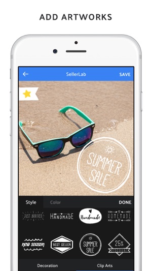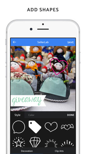 SellerLab is designed for online sellers who wants promote their products in social media easily and effectively. * You can apply 15 different filters on your photos. * Don't you want to use a photo? Select from many solid colors and gradients as backgrounds! * We've added many shapes and clip art…