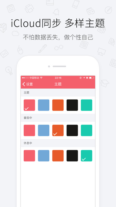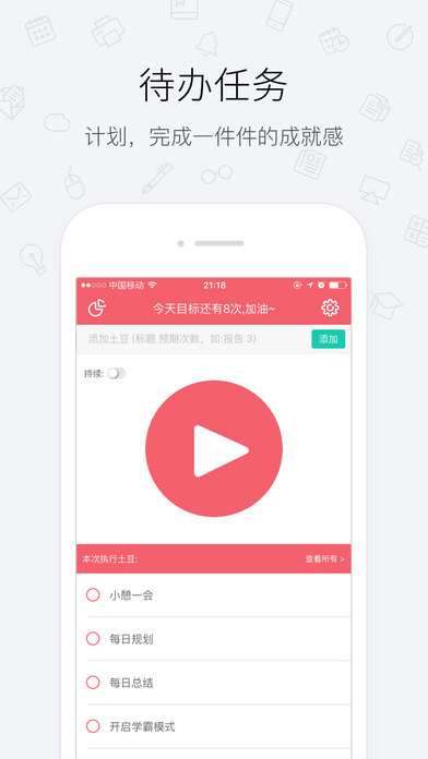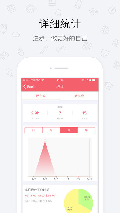-- 中国效率榜排行榜前10 -- 番茄工作法,只为提高工作效率 -- 专注工作、摆脱拖延症、计划管理、统计 番茄工作法是一种时间管理法方法,该方法使用一个定时器来分割出一个一般为25分钟的工作时间和5分钟的休息时间。专注某件事情,达到高效工作目的。 主要功能: **快速开启** 1.通过ios系统的spolight搜索1~60可快速开启番茄工作 2.支持3DTouch的手机支持快速开启番茄工作法 3.可在通知栏加入Widget快速启动 **快速操作计划** 1.右滑完成 2.左滑更多操作(再来一次、隐藏) **专注模式** 碰手机你就输了 **报表统计** 贴心地为你统计了每日、每周、每月、每年的番茄时钟统计,清晰看到你最近的工作效率和趋势.反思进步 **iCloud同步** 可同步到iCloud,换手机也可迅速找回番茄数据 **自定义专注时长和休息时长** 番茄时间:可自定义,默认25分钟 休息时间:可自定义,默认5分钟 **持续任务** 开启持续功能后,一个番茄结束后会自动开始下一个番茄,持续2小时,为你的健康着想 **每日目标** 设置每日目标,有目标才有动力,默认8个 **设置Todo完成期限** 方便查看每个任务的截止日期,有压力才有动力完成 **设置Todo的预期使用番茄次数** 有规划的任务,让你事半功倍 **更多主题** 适合个性化的你